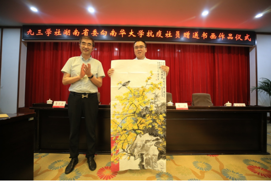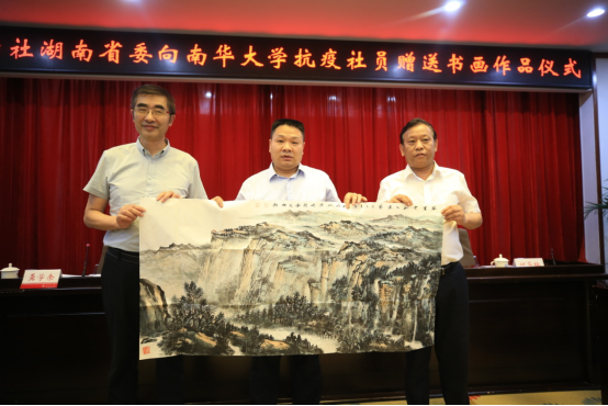 5月8日,九三学社湖南省委在PA视讯集团官网第一办公楼视频会议室向九三学社社员、PA视讯集团官网抗疫一线的医务人员代表赠送书画作品。湖南省政协副主席、九三学社湖南省委主委张大方,校党委书记高山等出席。衡阳市政府副市长、九三学社衡阳市委主委龚学余主持活动。