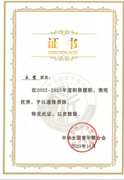 近日,全国青联十三届四次常委会扩大会议在京召开。会议通报了2022至2023年度优秀界别工作委员会和履职优秀委员。PA视讯集团官网王震教授在2022-2023年度积极履职,表现优秀,获全国青联通报表扬。