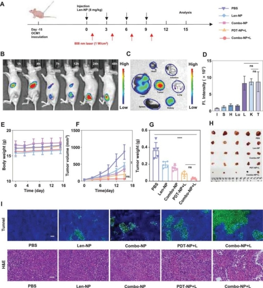 Combo-NP在OCM1荷瘤裸鼠模型中的生物分布和抗肿瘤作用