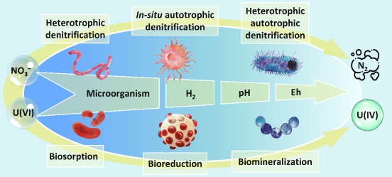 该综述全面考察了铀采冶矿山或农地周边地下水体中铀(VI)、硝酸盐污染问题,并重点针对该二种目标污染物协同去除的理论和实验基础进行了总结与展望。本综述还提供了地下水中铀(VI)、硝酸盐污染的生物修复技术的全面视图。同时提出了一种全新的自养反硝化和铀还原方法,即利用氢作为唯一的电子供体,通过控制氢和自养反硝化来调节pH和Eh,并在还原条件下维持U-C-O-H系统,最终实现二者的协同去除。与生物吸附和生物矿化相比,刺激微生物将U(VI)还原为U(IV)是一种很有前途的途径。该文也为落实国家建设环境友好型社会的大政方针,减少地下水体修复中所涉及的碳排放,实现2060年“碳中和”长期目标,提供了一个崭新的思路。此外,对于不同介质中复合污染物的联合去除也提供了科学参考。
