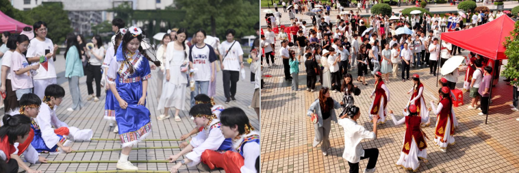 活动以《爱我中华》民族舞蹈火热开场,多民族学子身着绚丽民族服饰,以曼妙舞姿展现文化交融画卷,生动诠释“中华民族一家亲”。游园环节中,12个民族特色展台亮点纷呈:新疆展台前,金黄油亮的烤全羊引得师生驻足,身着艾特莱斯绸的学子热情科普,双语对照的民俗介绍十分醒目;藏族展台的切玛盒精美绝伦,传统工艺现场演示;壮族竹竿舞、土家族摆手舞、白族扎染、瑶族女书展示等文化体验丰富多彩;汉族展台由南华社区带来的“粽”享乐趣活动,让各民族师生沉浸式感受端午传统节日魅力。来自西藏的桑吉卓玛同学表示:“学好国家通用语言文字,让我更有效地推介家乡文化,也更深切地体会到中华民族大家庭的温暖。”