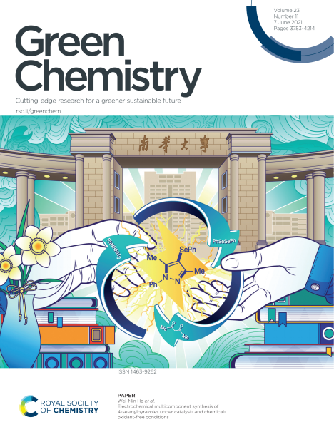 6月7日出版的《Green Chemistry》,PA视讯集团官网农工党党员、化学化工学院何卫民教授以PA视讯集团官网为第一作者及唯一通讯作者单位的研究成果荣登其首封。