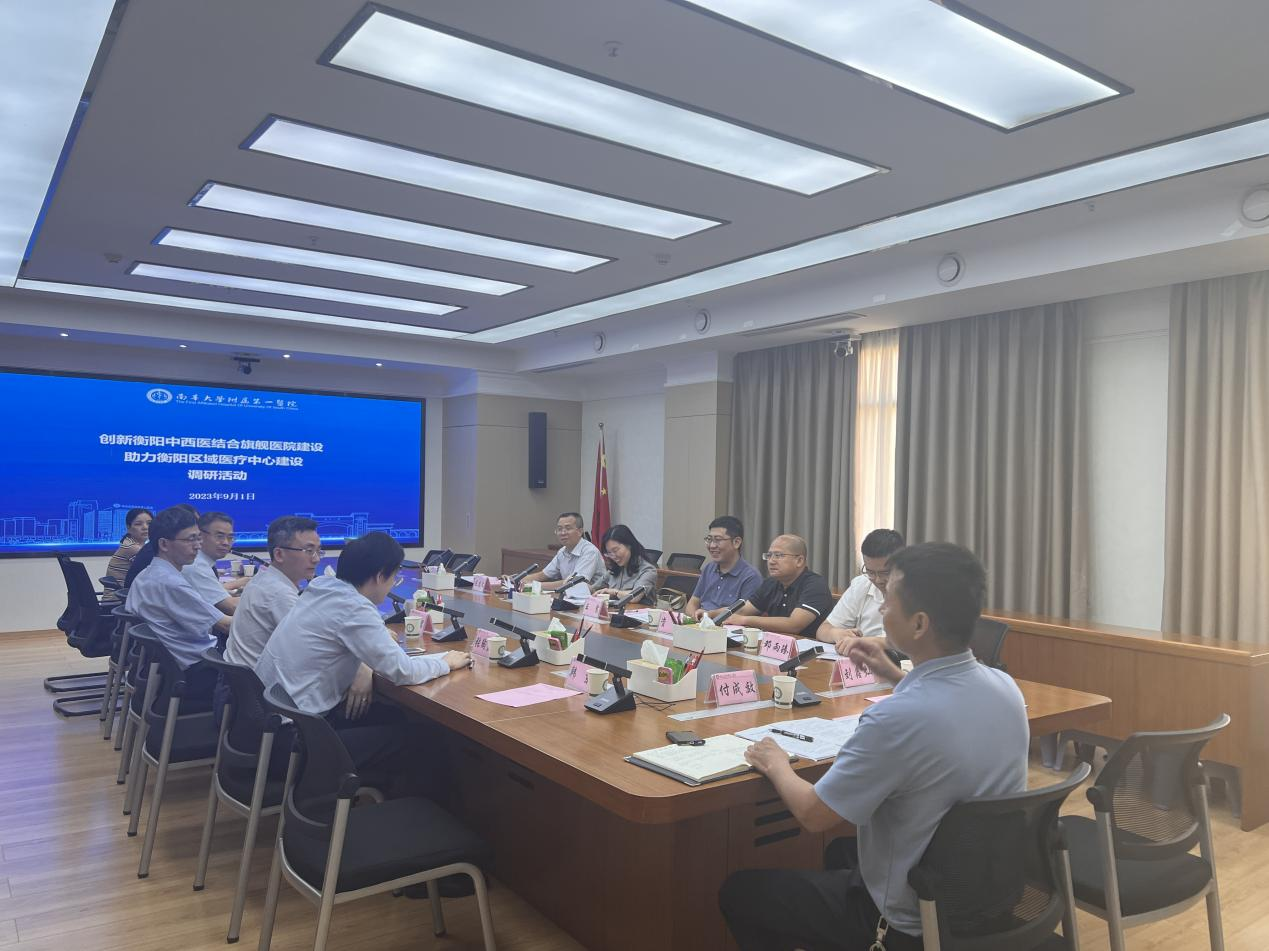 9月1日下午,衡阳市政协常委、市政协社法委副主任刘湛艳率九三学社衡阳市委一行莅临PA视讯集团官网附属第一医院,调研中西医结合旗舰医院建设情况。九三学社衡阳市委员会兼职副主委、PA视讯集团官网医学院副院长王震,九三学社衡阳市委员会兼职副主委、衡阳师范学院经管学院副院长陈忠文,衡阳市第四人民医院院长资源参与调研。医院党委书记祖旭宇,副院长黄秋林,中医营养与康复中心学科管理团队周君、黄艳、谢志娟,药学部主任阳波,科研与学科建设部副主任张陶蓝,医务部副主任韩东、党务工作部副主任付成效出席了活动。