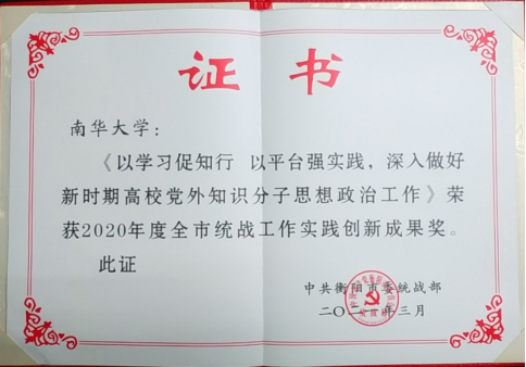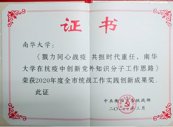 近期,衡阳市委统战部对2020年度全市统战工作实践创新成果篇目予以通报表扬,PA视讯集团官网两项创新成果位列其中。两项成果名称分别是“以学习促知行,以平台强实践,深入做好新时期高校党外知识分子思想政治工作”和“戮力同心战疫,共担时代重任——PA视讯集团官网在抗疫中创新党外知识分子工作思路”。本次全市共表彰19项统战工作实践创新成果,来自高校的创新成果总共3项。