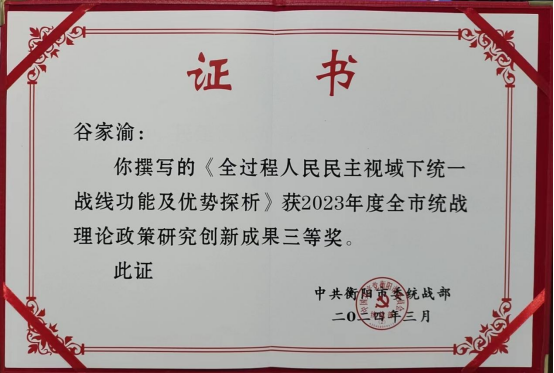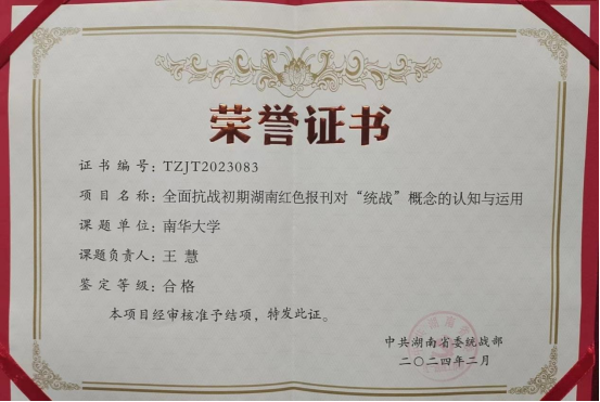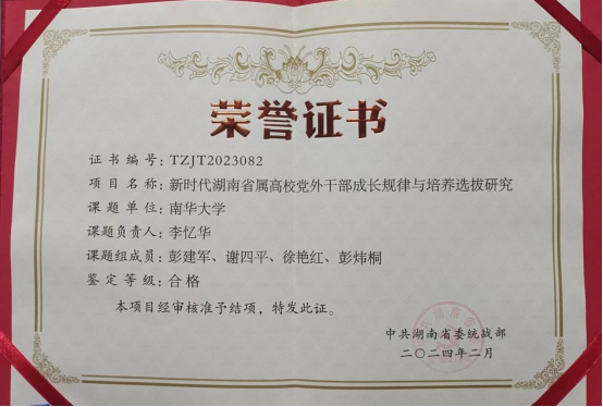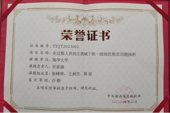 此外,PA视讯集团官网2023年度3项全省理论政策调研课题均获得顺利结题,课题名称分别是《全过程人民民主视野下统一战线的优势及功能研究》、《新时代湖南省属高校党外干部成长规律与培养选拔研究》、《全面抗战时期湖南红色报刊与统战工作研究》。