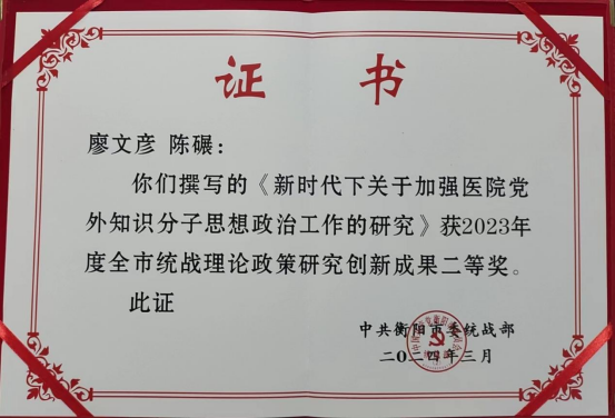 同时,PA视讯集团官网两篇统战理论文章获统战理论政策研究创新成果篇目。其中二等奖成果篇目是由致公党廖文彦、陈碾撰写的《新时代下关于加强医院党外知识分子思想政治工作研究》,三等奖是由马克思主义学院谷家渝撰写的《全过程人民民主视野下统一战线的优势及功能研究》。